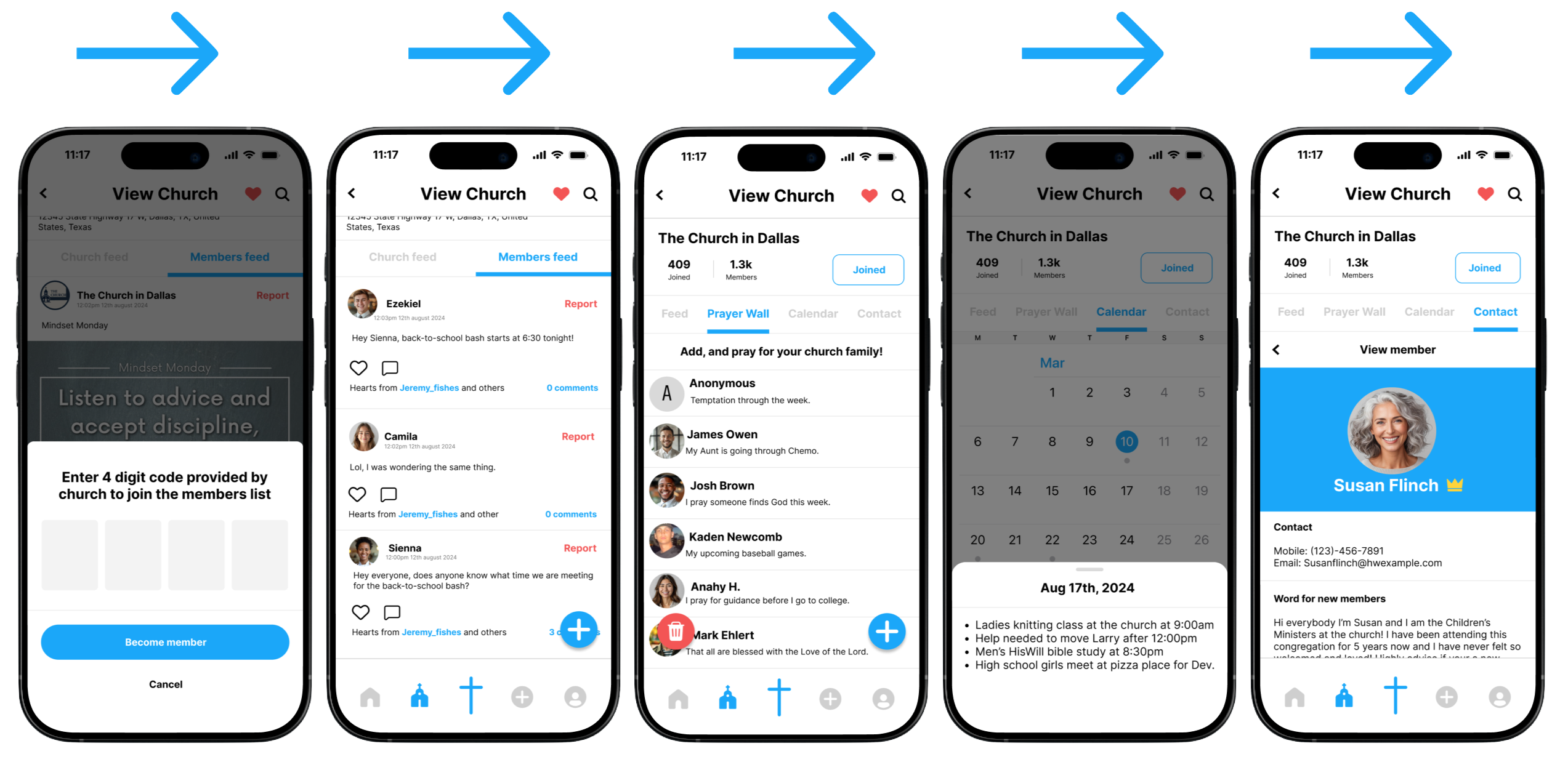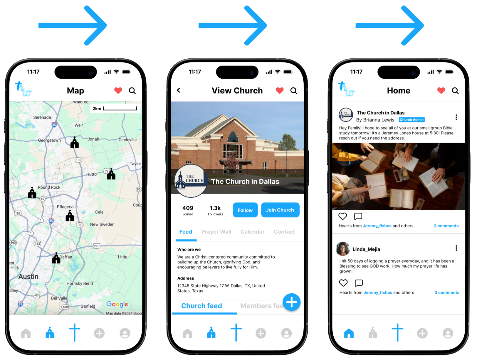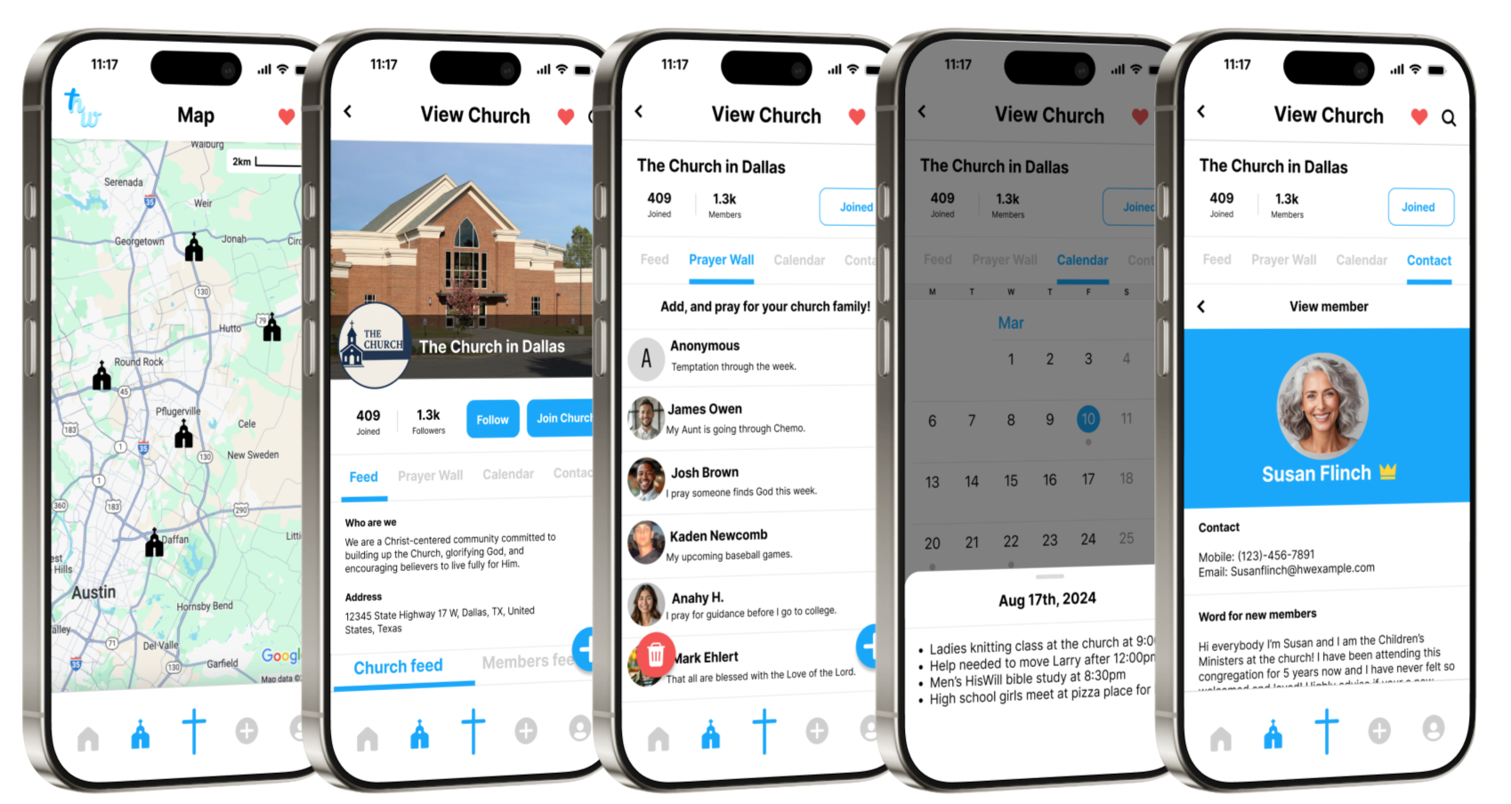 As soon as you reach out, we put the Church on the map and give the Church a private code to have access to these features Below:1. Members Feed: Only members of the Church can see.2. Prayer Wall: Share prayers,